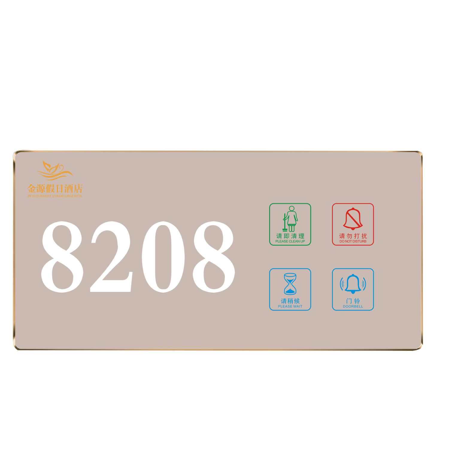 3、客人按下房間內(nèi)的"請(qǐng)即清理”開(kāi)關(guān),液晶屏的"請(qǐng)即清理”圖案背光亮起, 門(mén)外顯示屏中提示房間需要清理。