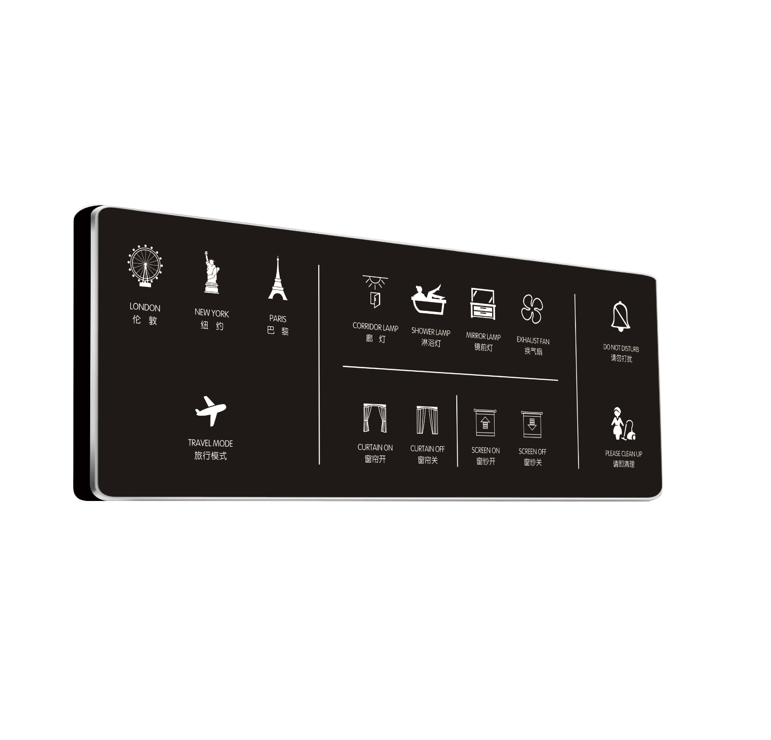 背光:開燈狀態(tài)下,背光圖標(biāo)高亮,方便客人識(shí)別,關(guān)燈狀態(tài)下溫馨弱背光;